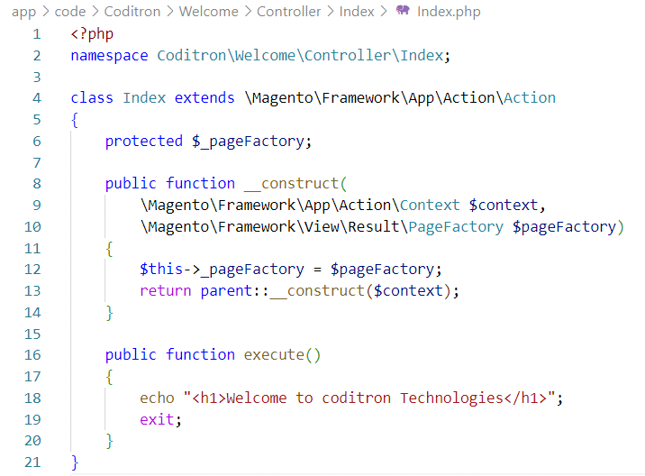 Create a file Index.php in the app/code/Coditron/Welcome/Controller/Index/ folder.
