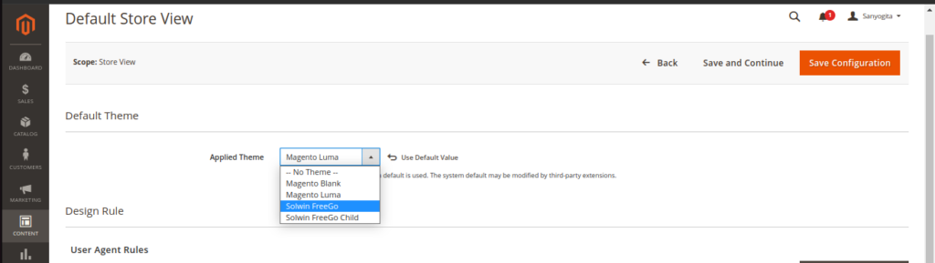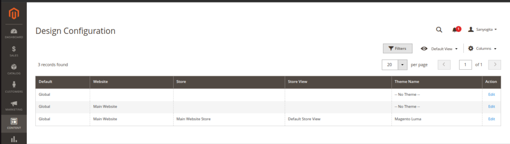 a) Login to the admin panel of the Magento store and go to the content>Design>Configuration.